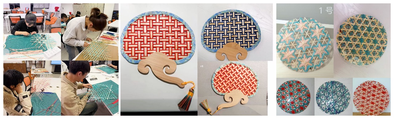 该模块中,学生们通过学习传统竹编的基本技法,如十字纹、菱形纹、六角孔等,亲手制作“祥云扇”和“亚克力竹编垫”。其中,“亚克力竹编垫”是课程的一大创新点——将柔韧的竹篾与透明的亚克力板结合,探索传统材料在现代家居中的新应用,让古老的编织技艺焕发出简约、时尚的光彩。